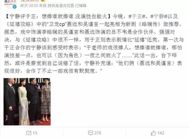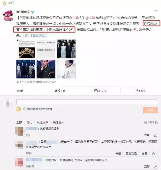 后来于正疑似回应宁静的“ 于老师的戏很捧人,想捧谁就捧谁,哪怕演技差一点,也可以一夜之间就火了。”这句话说了一句“你只能说喜不喜欢谁的表演,不能说谁好谁不好”。
