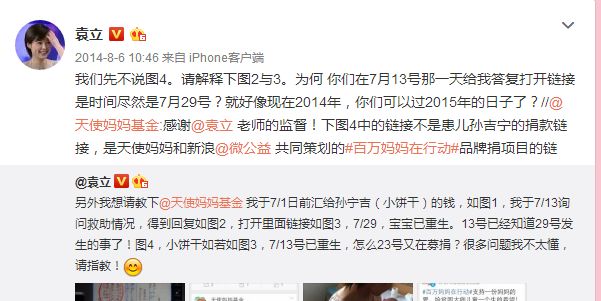 2014年7月1日,袁立通过“天使妈妈基金会”捐钱给病重的孩子孙宁吉3万元,7月13日追问孩子的捐助进度,这时候,奇怪的事情发生了,她看到的页面显示日期是7月29日。