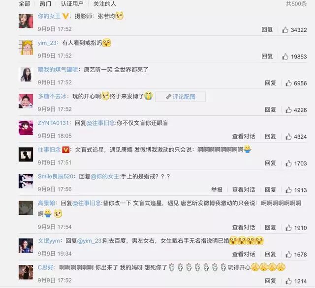 虽然唐艺昕什么也没说,配文也是几个简单的笑脸表情,但俗话说,女生如果在右手无名指上戴上戒指,就表明她已婚。评论区的网友们也是一片欢欣鼓舞,纷纷为唐艺昕和张若昀感到高兴。