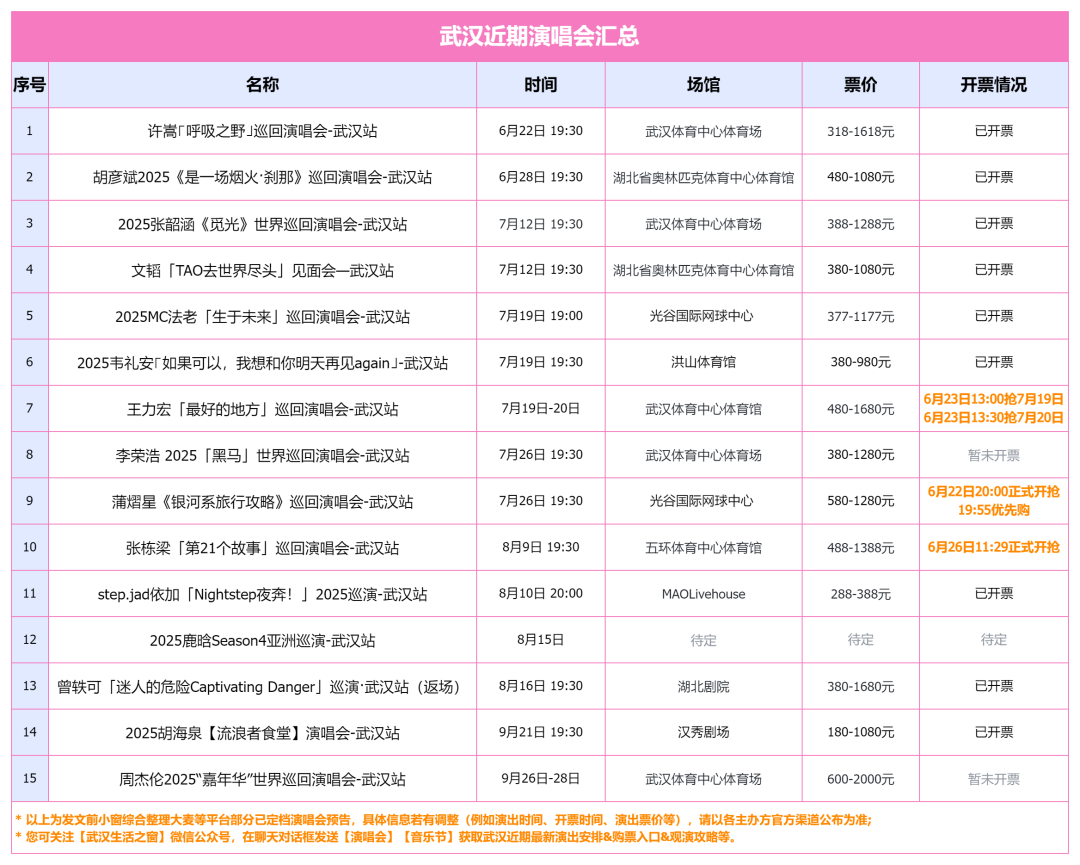 ?购票入口 | 关注武汉生活之窗微信公众号,在聊天对话框发送“演唱会”,获取王力宏演唱会武汉站预约购票入口,后续还将更新观演攻略等