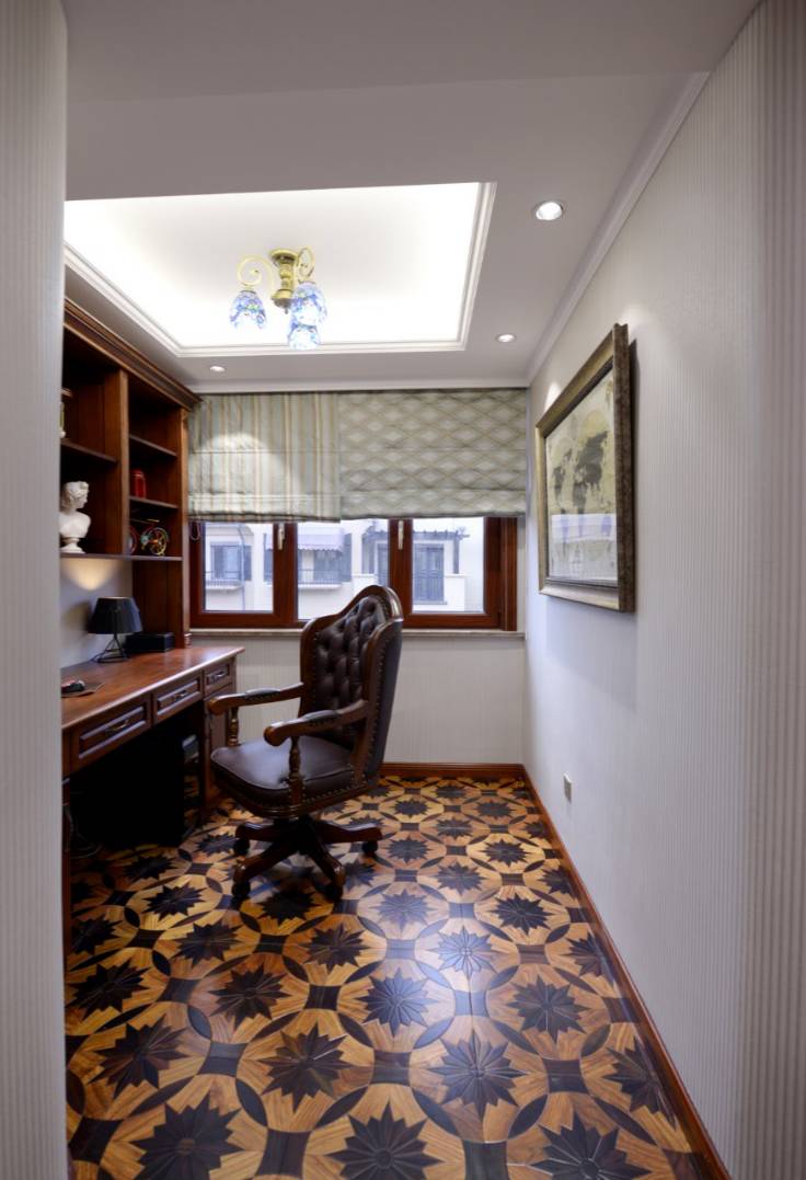 上到二楼,刺花的铺贴,使得层与层之间的区分非常清晰,给人们在视觉效果的跳动和反差,让书书房的空间不再沉闷。