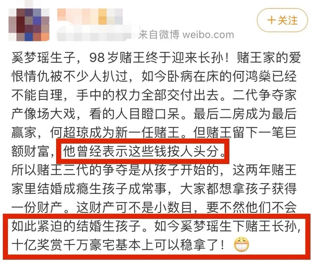 有网友猜测,之前赌王说过“财产要按人头分”,那么奚梦瑶至少都能拿到10亿奖赏!