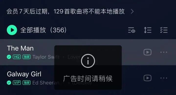 听歌的时候,用户基本不会盯着手机屏幕,要么插上耳机放在口袋里面揣着,要么放在一旁外放,这就导致了用户无法预判插入的广告,进而听歌的体验感大大下降。