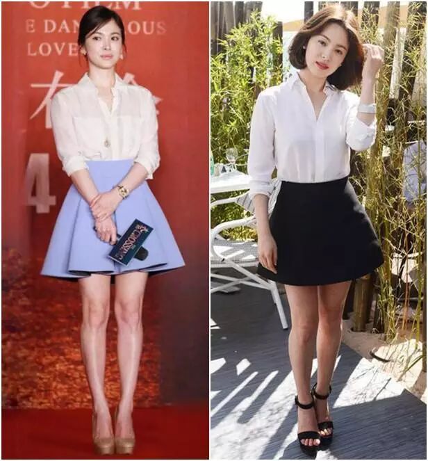 如果你是小粗腿的姑娘,可以学学宋慧乔穿A字裙,无论是百褶的还是简单的剪裁,简约大方,还能显腿长。