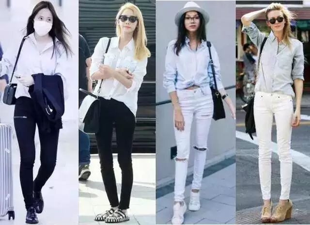 小白/黑裤子可是气质单品中的气质单品,配上牛仔质感的衬衫,舒适又养眼,黑色更显瘦,想要穿出大长腿,一定不要忘了将衣服扎进裤子里,或者系个结打造出高腰线。