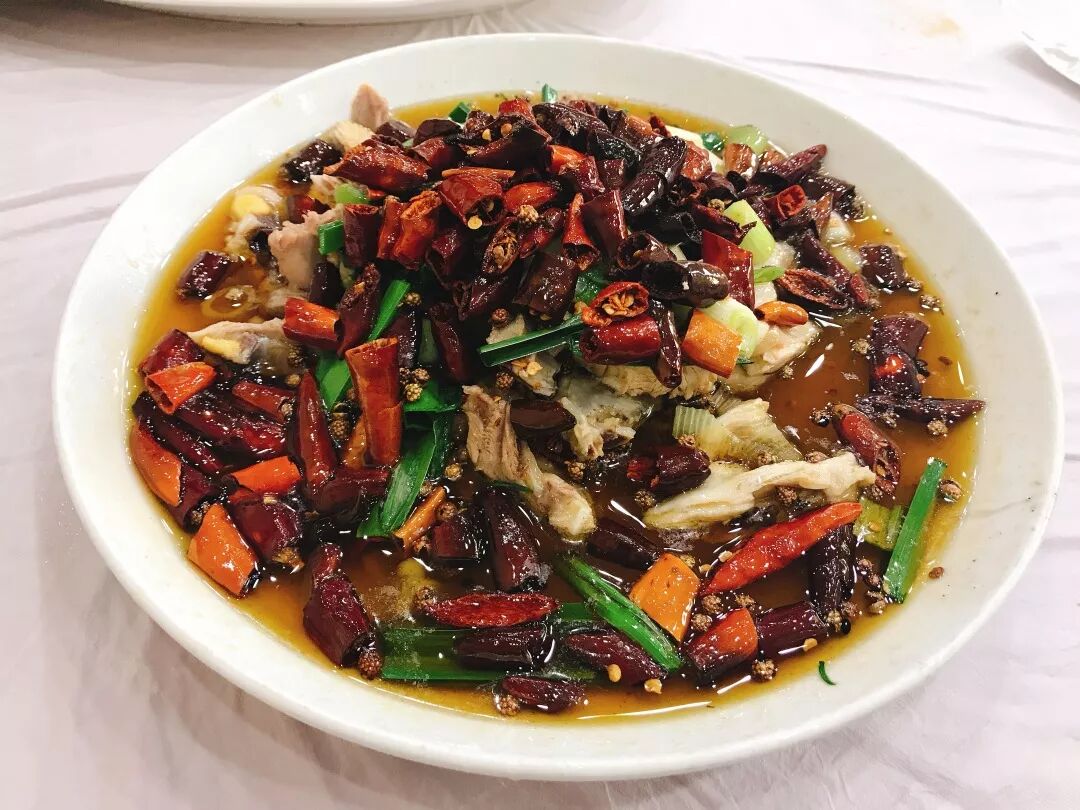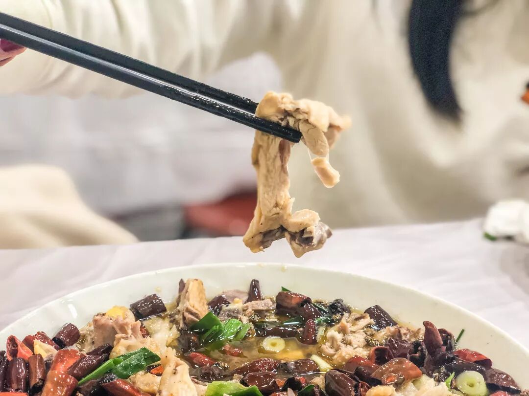 大小均匀的鸡肉被红油浸泡着,表面被辣椒、花椒和葱段覆盖,看起来很辣。将佐料与鸡肉搅拌均匀,夹起一块吸收了汤汁的鸡肉