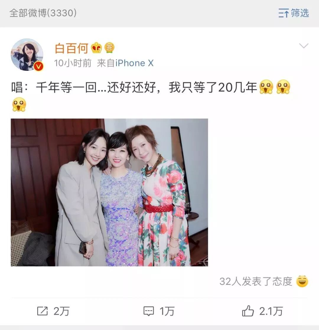 近日,白百何就发布了一条微博:“唱:千年等一回...还好还好,我只等了20年!”