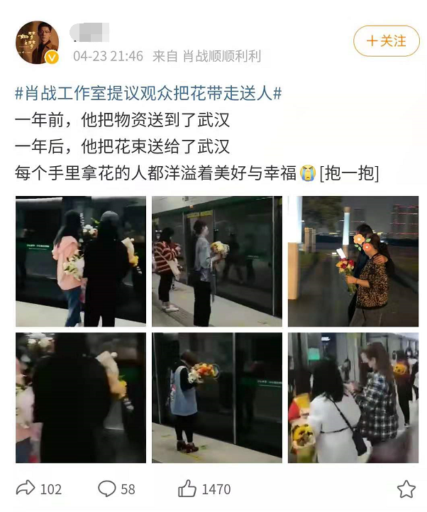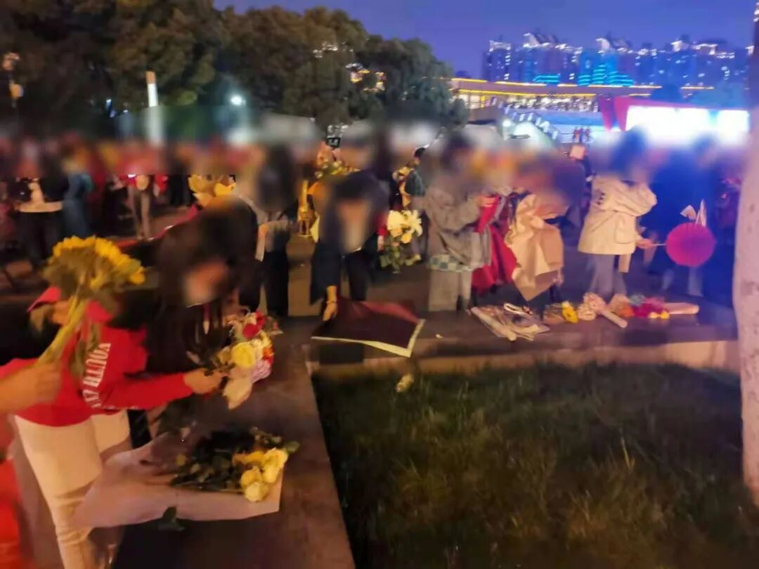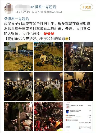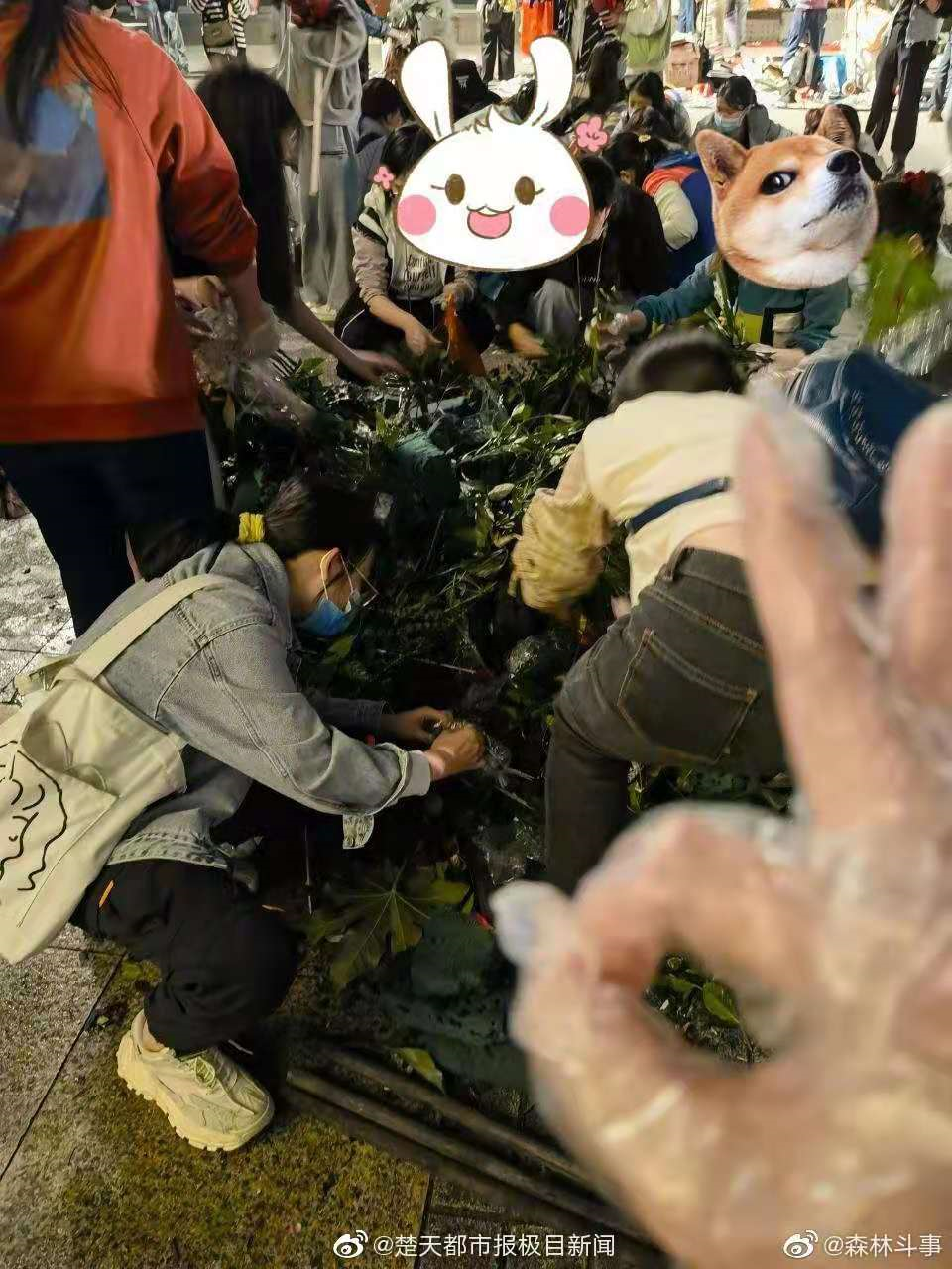在武汉读大学的王同学表示,粉丝会建立了志愿者群,从下午开始就在现场维持秩序并帮助规范摆放花篮。而在工作室发布微博后,志愿者们就开始组织把花分给市民。