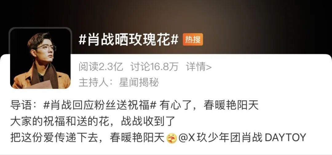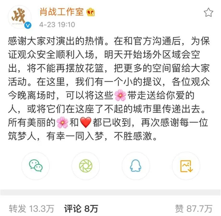 不过,因为花束太多,担心影响到观众的入场安全,更为了避免浪费,肖战工作室于23日19:10发布微博表示,所有的鲜花和心意肖战都已收到,更号召在当晚演出结束后,观众可以在离场时将鲜花带走,“将这些花带走送给你爱的人,或将它们在这座了不起的城市里传递出去。”