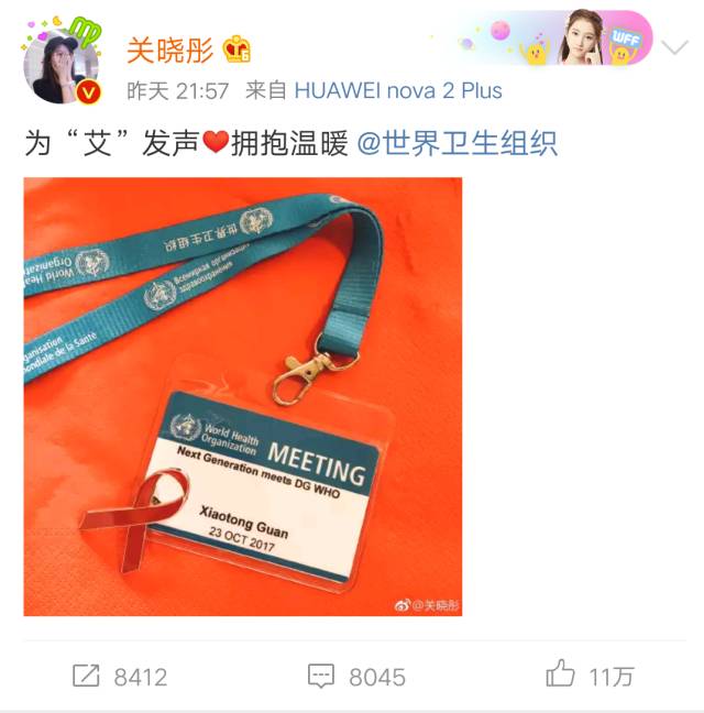 关晓彤随后又在微博上发出声明,说“为“艾”发声,拥抱温暖”,还艾特了世界卫生组织。
