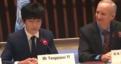 她作为唯一的青年女生代表,当天穿着浅粉色西服套装,胸前戴着艾滋病的红丝带标志,干练又不失青春活力。