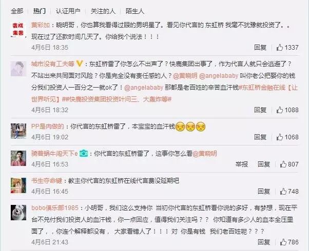 最近,黄晓明陷入了大危机,网传他代言并且担任合伙人的东虹桥P2P金融平台跑路了。一时间,众多网友在黄晓明的微博讨说法,评论被债主攻陷,甚至出现了#一起召唤黄晓明来还钱#这样的微博话题。