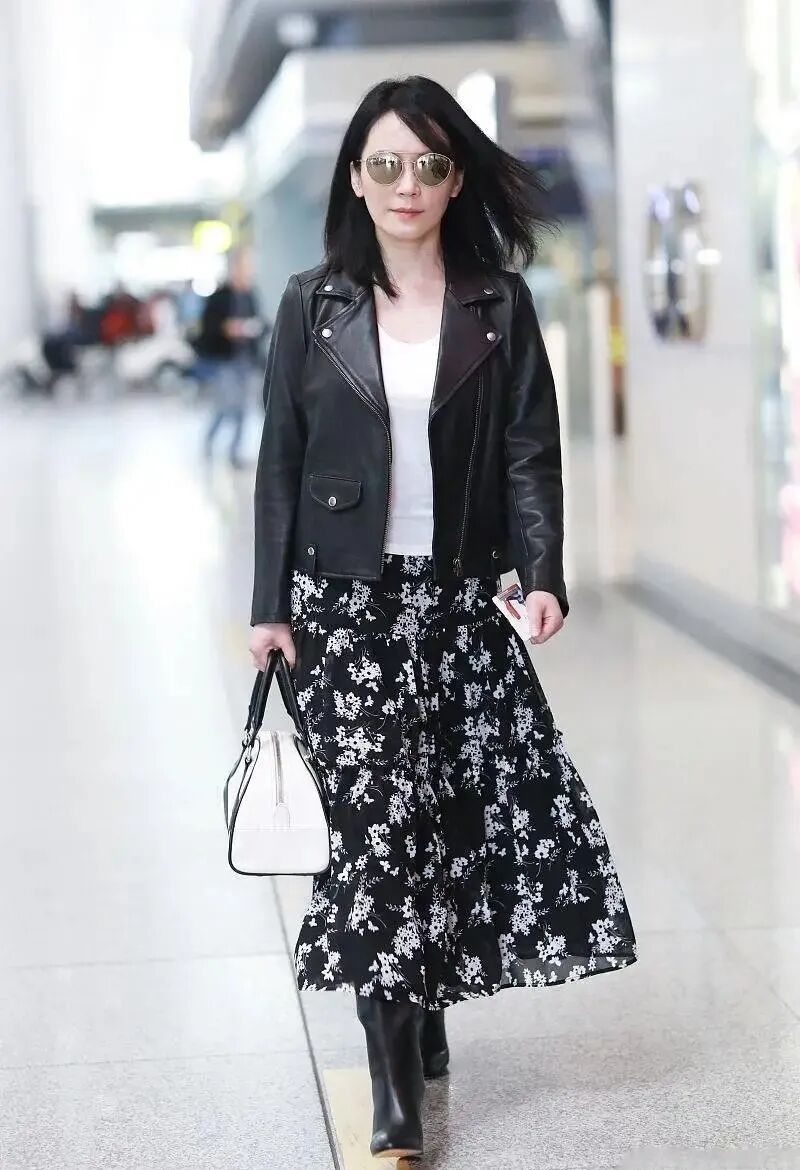 如果把 "活力元素 "移到下半身,最常见的方式就是选择像俞飞鸿那样的花裙子。上半身是干净利落的黑色皮衣,下半身是薄而优雅的真丝裙,刚柔并济,使女人的气质更加丰富生动。在黑色的裙子上,白色的樱花枝条争奇斗艳,确实充满了春天的气息。
