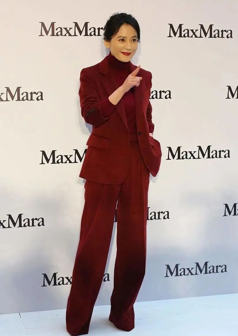 姐妹们还用漂亮的颜色来提高醒目的效果。为了避免花哨,可以选择纯色套装,而像俞飞鸿选择的酒红色,色调比较丰富柔和,不会让人看得眼花缭乱,更符合优雅的韵味。