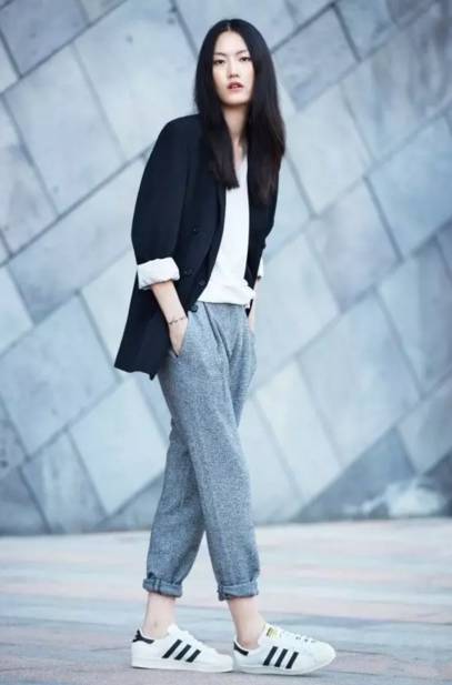 牛仔裤、西裤+运动鞋