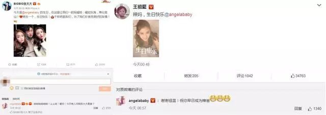 比如baby的闺蜜团杨幂和张大大都在凌晨就送出了祝福,baby还特意在下方留言。跑男团的王祖蓝也在微博上晒出baby的美照,baby也及时回应感谢了。