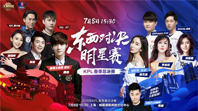 2018年KPL春季赛总决赛明星阵容集结完毕,西部《极速王者团》鹿晗、郎朗、潘晓婷、XQ丶AT、GK.黄大仙;东部《爱情公寓队》娄艺潇、李金铭、刘萌萌、QGhappy.Cat、RNGM.虔诚,陈赫将远程打Call明星赛。