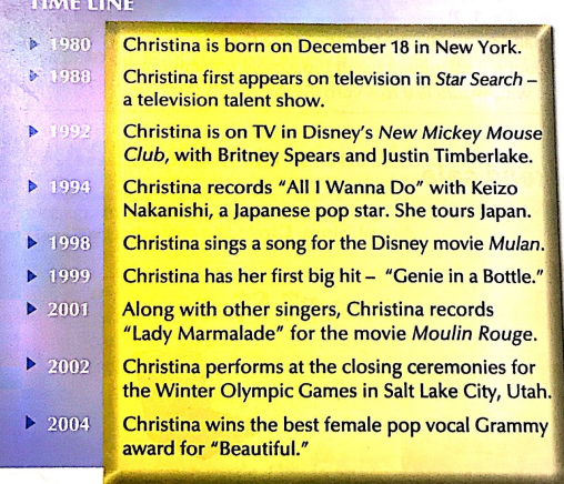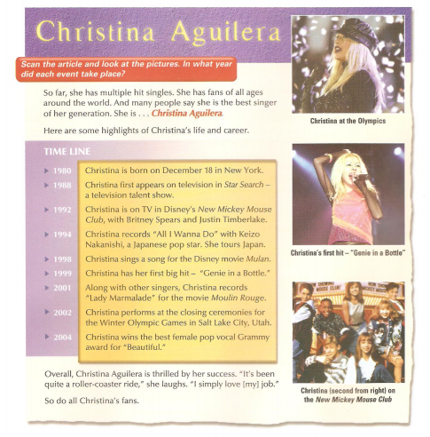 So far, she has multiple hit singles. She has fans of all ages around the world. And many people say she is the best singer of her generation. She is . . . Christina Aguilera.