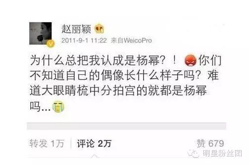 随后,赵丽颖在横店被喊“杨幂”,由于粉丝的“再次”认错人,赵丽颖似乎有些无奈,在微博发文:“为什么总把我认成是杨幂?!你们不知道自己的偶像长什么样子吗?难道大眼睛梳中分拍宫的就都是杨幂吗…”
