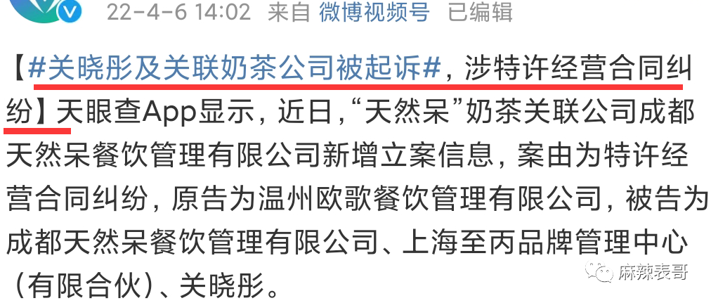 起因是她和她的关联奶茶公司被起诉,涉特许经营合同纠纷。