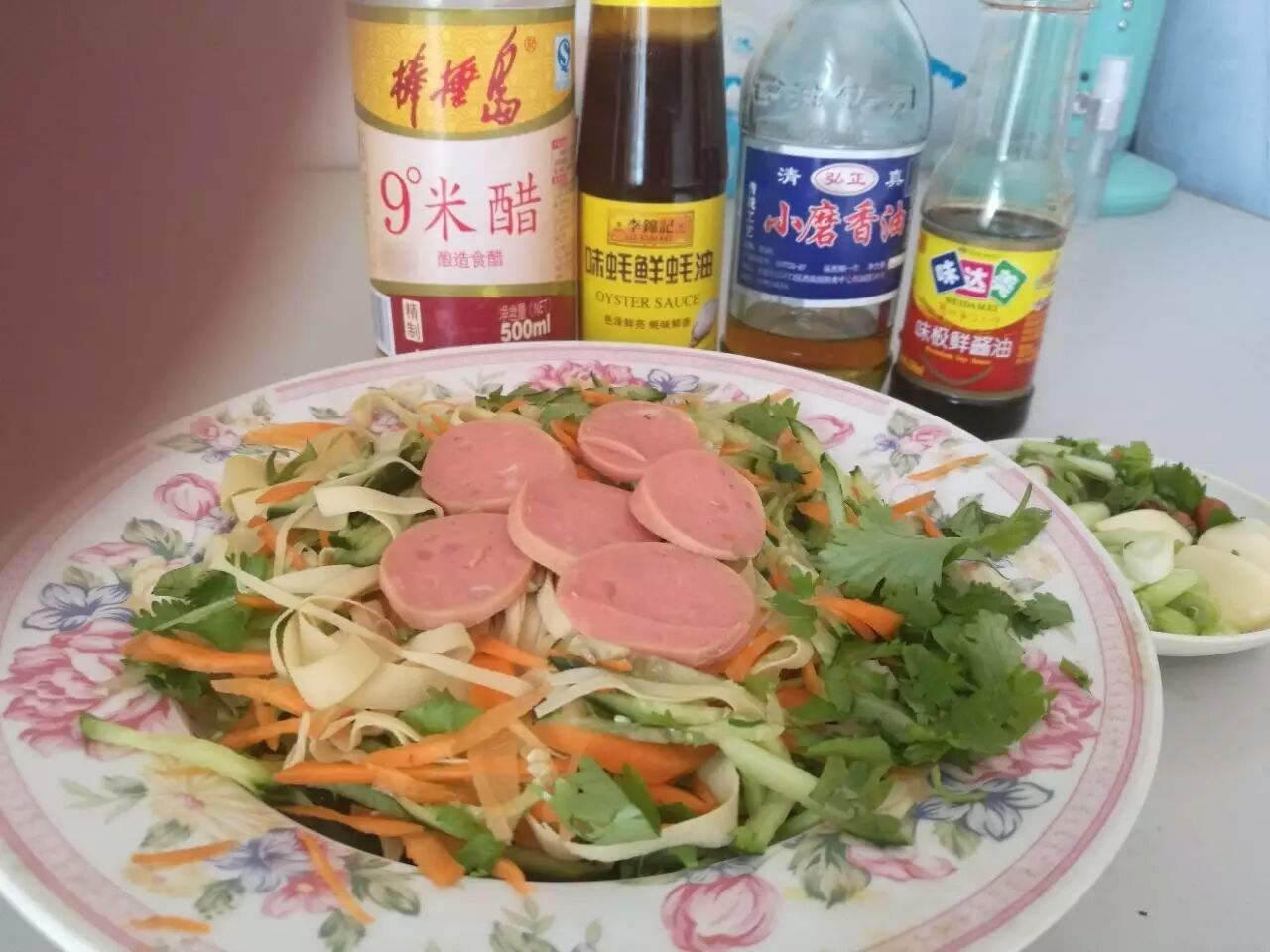 2、把所有的菜洗净,改刀。黄瓜胡萝卜切丝,香菜切段。葱切段。