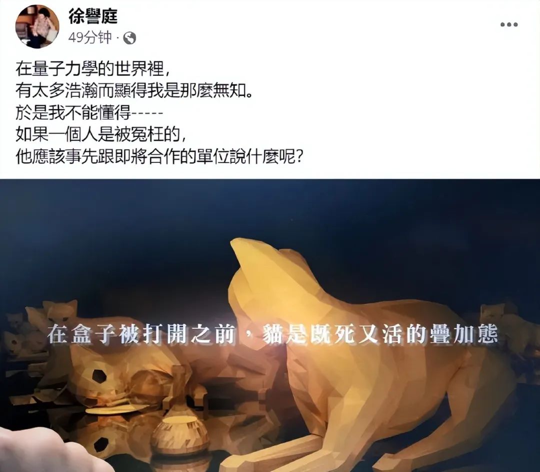 在贺军翔被剧组解约后,台湾省知名编剧徐誉庭为其发文鸣冤。徐誉庭的代表作有《天堂来的孩子》、《荼蘼》等剧,她以剧集《不够善良的我们》里出现的薛定谔的猫理论谈贺军翔换角一事,发问:如果一个人是被冤枉的,他应该事先跟即将合作的单位说什么呢?