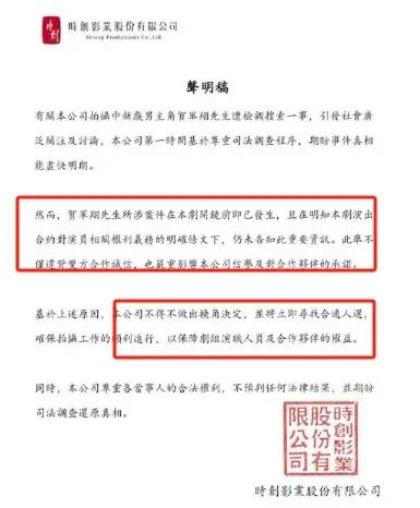 时隔一个月,时创影业发布声明宣布取消与贺军翔的合作,说明贺军翔的案件调查结果并不理想。在声明中,公司表示尊重司法调查程序,希望查明真相,但是贺军翔涉及案件明明发生在开机前,却不告知剧组背离了合约规定,违背了双方合作诚信,也影响了公司信誉和合作伙伴的承诺。基于此,必须换角,并立即寻找合适人选,保证剧组正常运行,其他人的利益也得到保障。