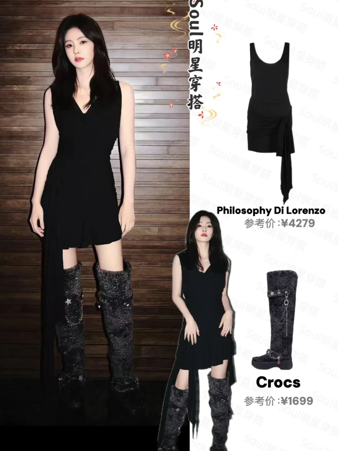 脚上的Crocs豹纹长靴无疑是这套穿搭的一大亮点。豹纹元素向来是时尚界的经典,自带野性与时尚感。长靴的款式不仅修饰了腿部线条,让双腿看起来更加修长笔直,还与黑色连衣裙形成了强烈的风格碰撞。靴子上的装饰细节,如星星、链条等元素,进一步提升了靴子的时尚度,使整体造型在酷帅中又带有一丝俏皮与华丽。
