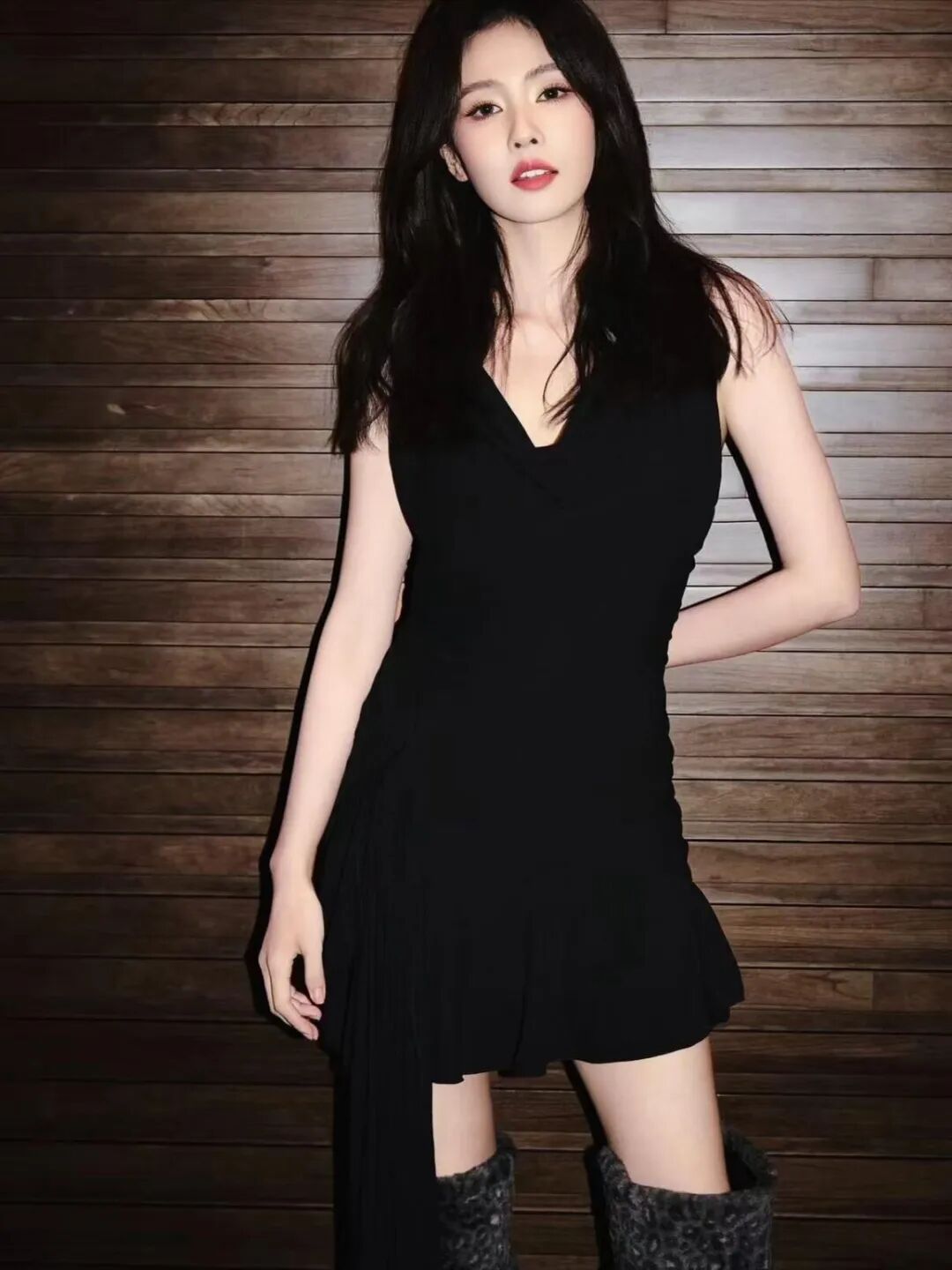 白鹿此次的穿搭主打黑色系,整体风格酷飒中又不失性感。她身着一件Philosophy Di Lorenzo无袖黑色连衣裙,V领设计巧妙地拉长颈部线条,展现出优雅的天鹅颈。裙子的剪裁贴合身体曲线,将她的身材优势完美呈现。而裙子一侧的不规则褶皱设计以及垂下的长条布料,为整体造型增添了一份灵动与随性,打破了黑色可能带来的沉闷感,使整个穿搭更具层次感和设计感。