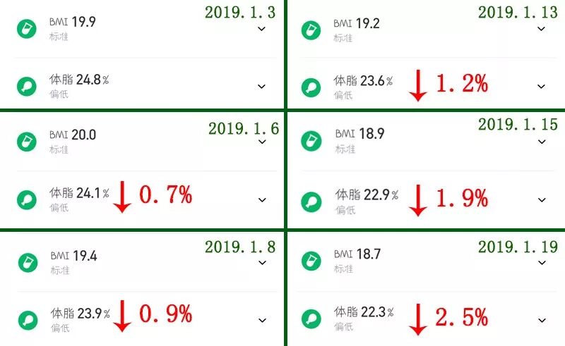 不仅仅是掉了体重,我的体脂明显下降了!刚开始吃的时候,体脂接近25%,两个多礼拜过去,体脂降到了22.3%!