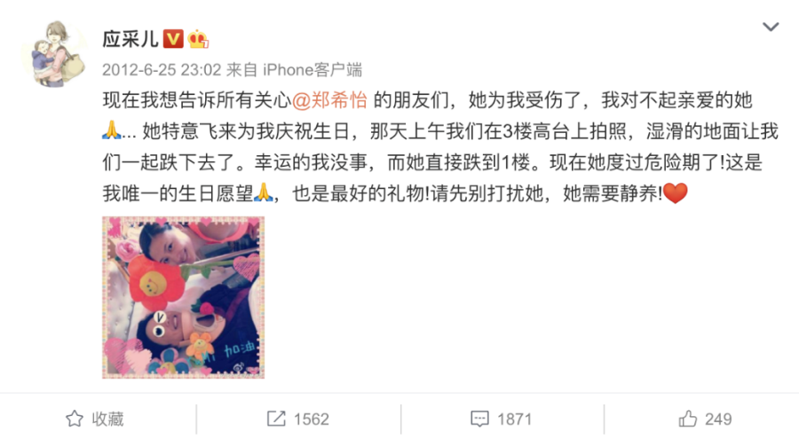 醒来之后的郑希怡跟大家报了平安:OK,未死!