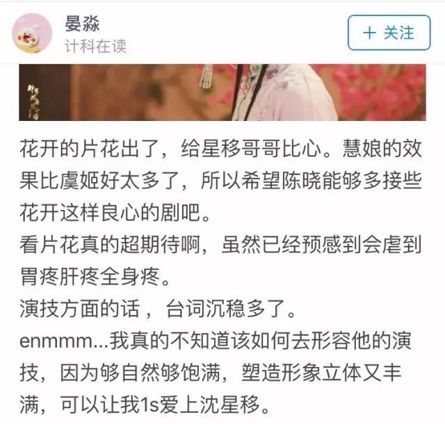 不过话说,前期吴聘戏太足,差点让人忘了剧的男主是沈星移,是陈晓!