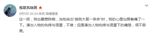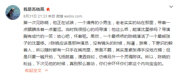 这次在剧中,陈晓对于沈星移的把握也是可圈可点,苏晓苑最开始甚至还怀疑陈晓是否可以演好沈星移,而后来她说:“一个最乖乖的陈晓演活了一个最熊孩子的沈星移。”