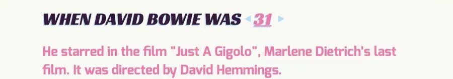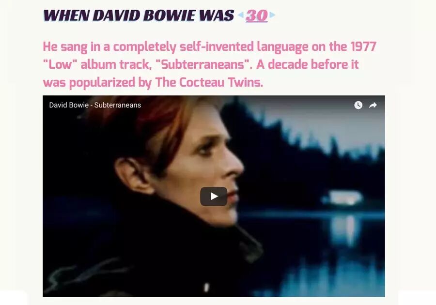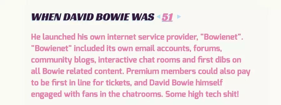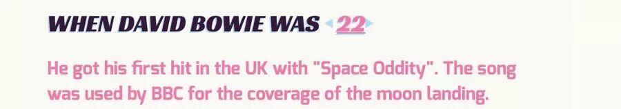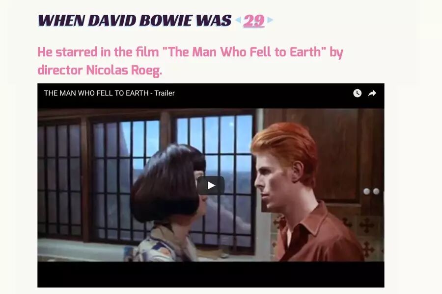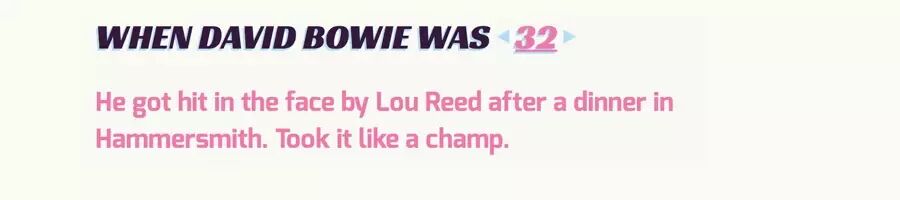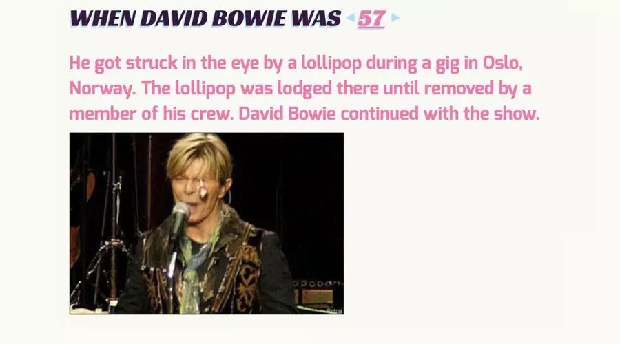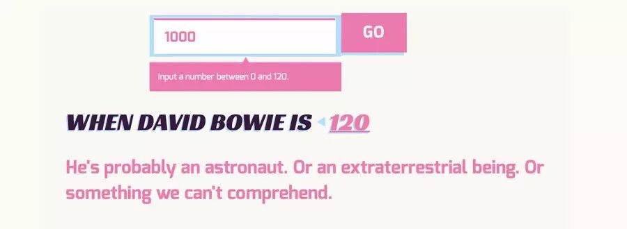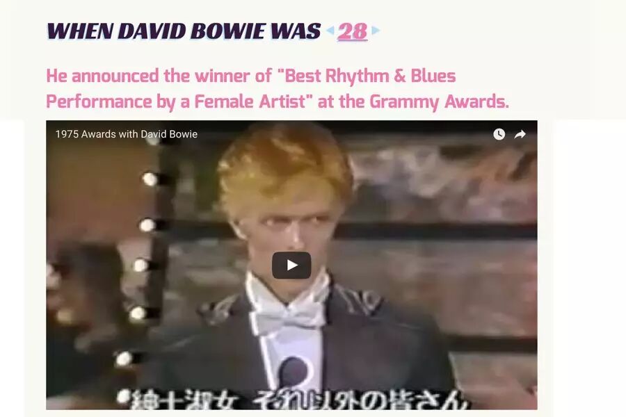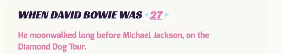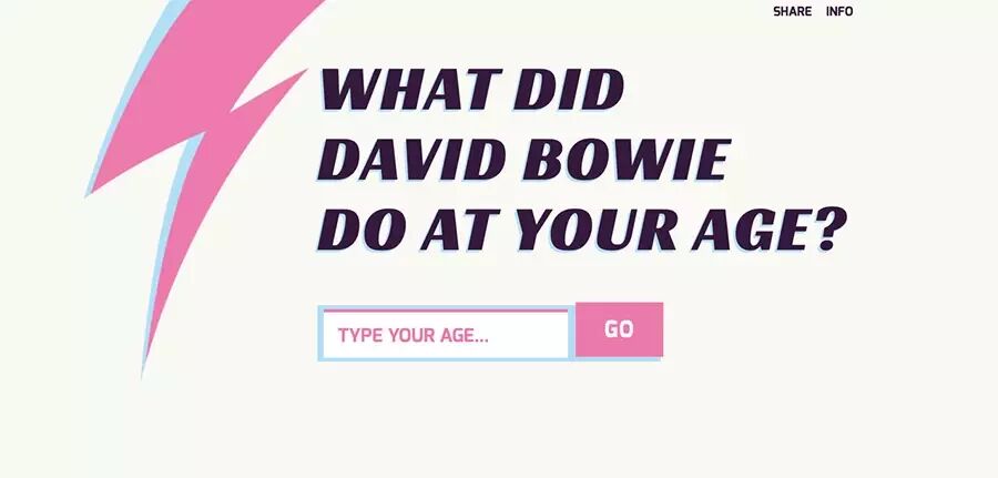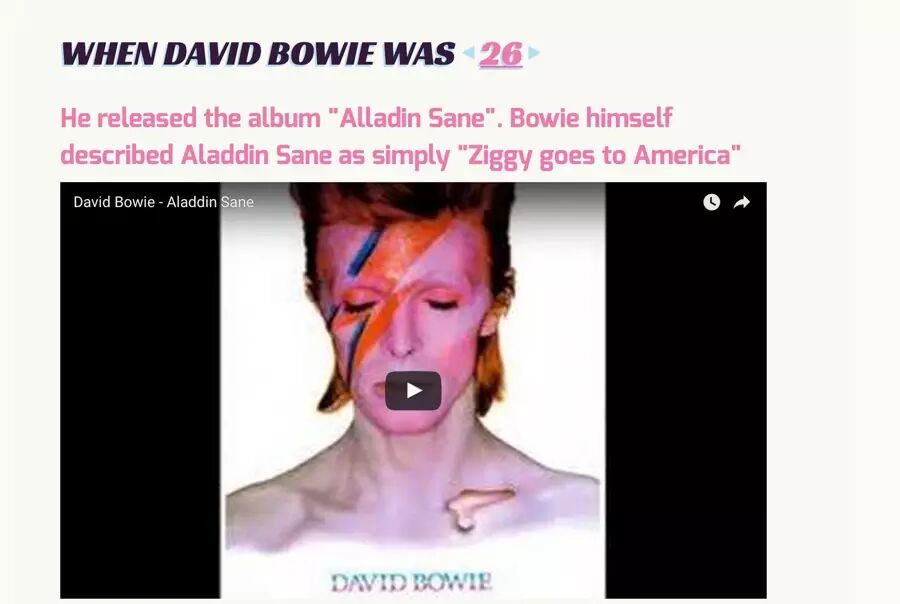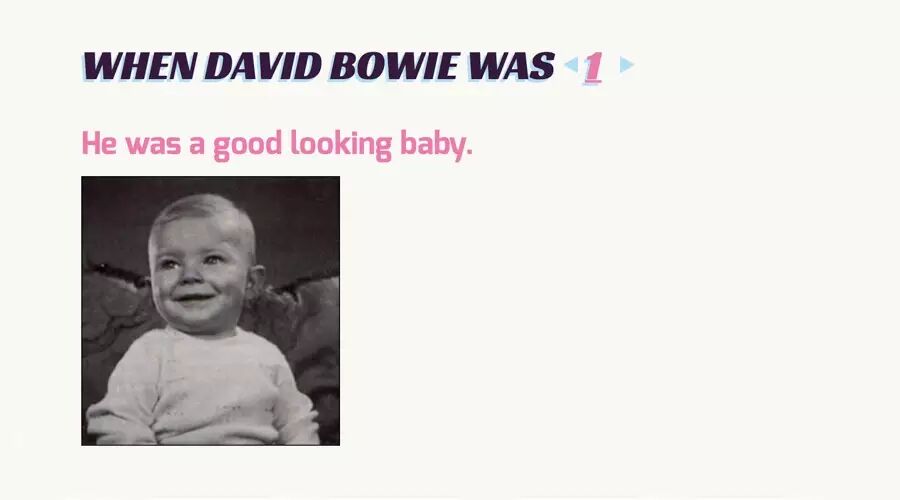 界面像下面这样,输入你的年龄,就能看到David Bowie在你这个年纪干了啥……