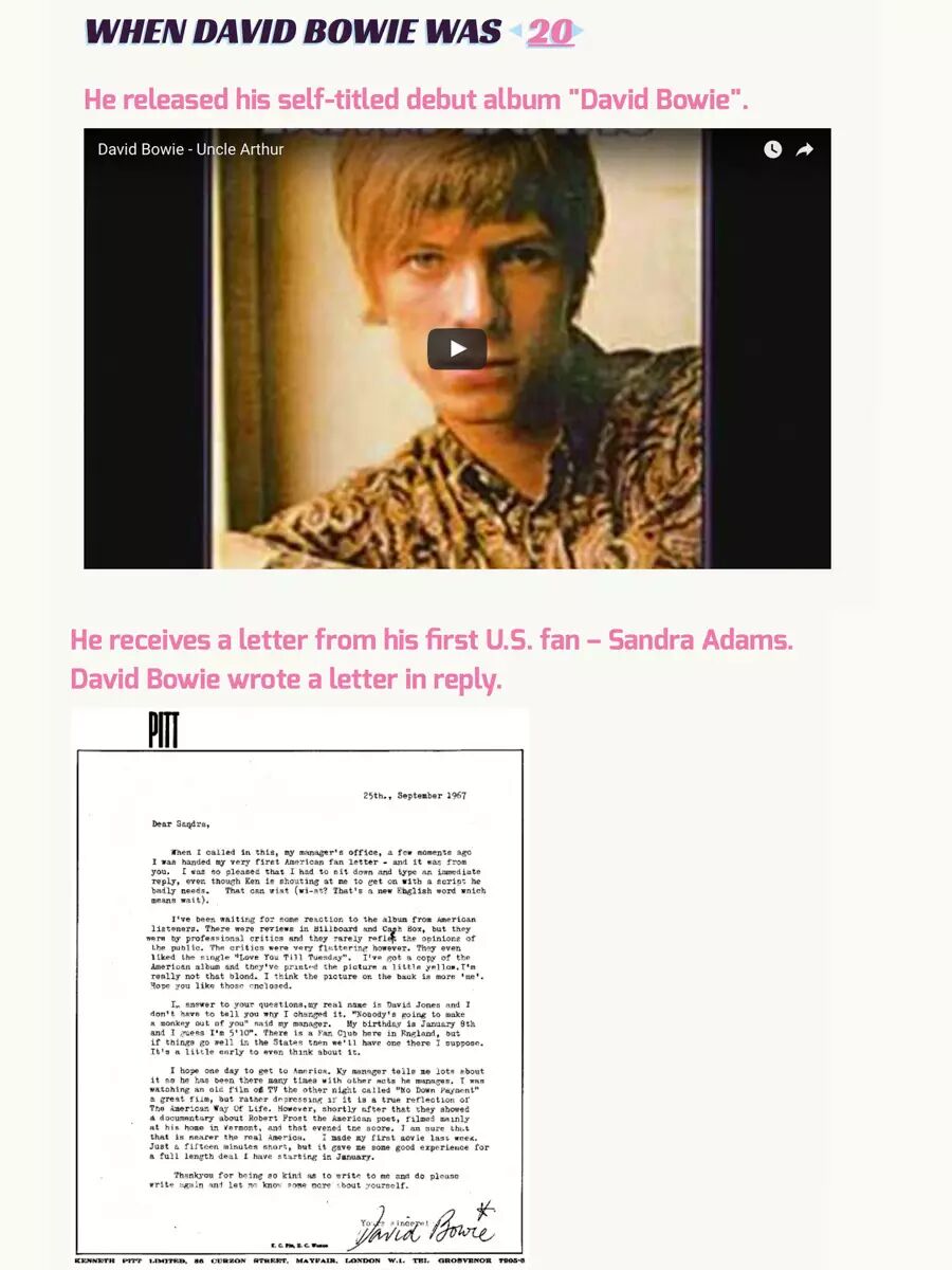 他出了第一张同名专辑'David Bowie',还收到了平生第一封美国歌迷的来信