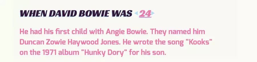 和Angie生了第一个孩子,他们给他取名Ducan Zowie Haywood Jones。他还在1971年发布的专辑"Hunky Dory"里写了首"Kooks"送给自己的儿子。