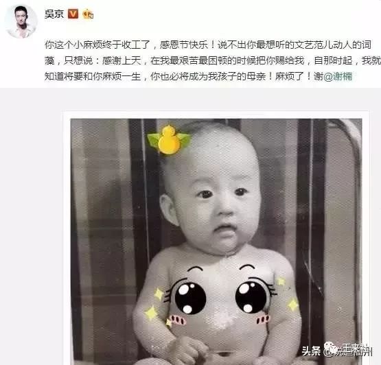 有一年感恩节的时候,吴京对谢楠说:你这个小麻烦终于收工了,感恩节快乐!我说不出你最想听的文艺范儿、动人的词藻,只想说:感谢上天,在我最艰苦最困顿的时候把你赐给我,自那时起,我就知道将要和你麻烦一生,你也必将成为我孩子的母亲!麻烦了!谢!