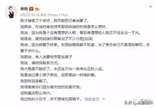 谢楠说:“我是说过拿小房子养他,但那是战一(电影战狼1)时候的事。就别张冠李戴了。我很谢谢你们因为喜欢他然后喜欢我。但我真没那么伟大。我过我的小日子,并不想被扣高帽子。”