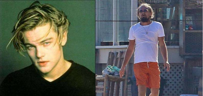 最有代表性的就是小李了。想当年饰演泰坦尼克号男主杰克时,处在颜值巅峰的他,不知道让多少女生为之疯狂。可是后来呢,就成了下图这幅样子…