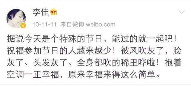 2010年11月11日时,李佳还自称要过“光棍节”: