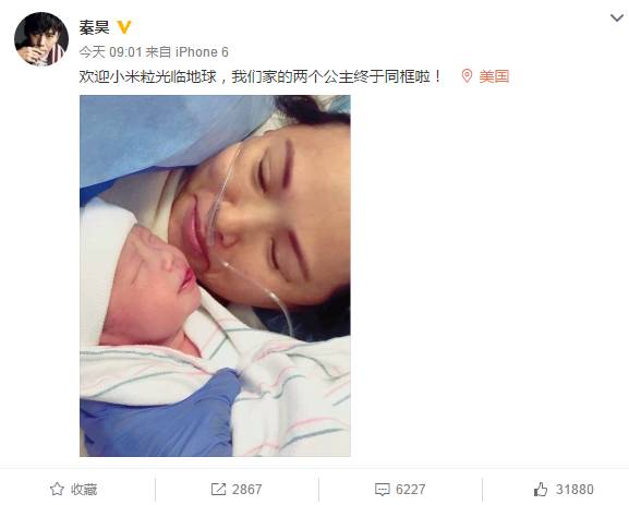 大早,秦昊发微博晒妻子伊能静与刚出生女儿的合照,并配文称:“欢迎小米粒光临地球,我们家的两个公主终于同框啦!”