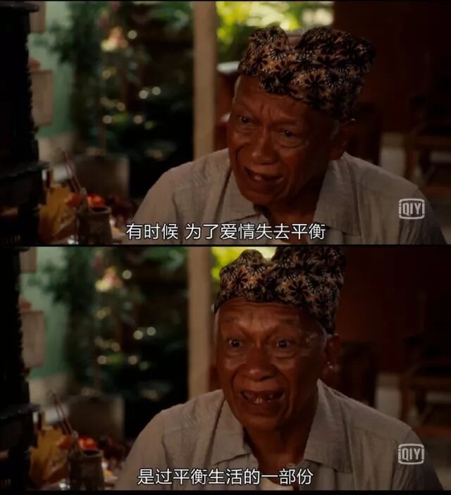 在巴厘岛,当女主害怕内心的平衡会因为新恋情而打破时,巫医和她说:“有时候,为爱情失去平衡,也是过平衡生活的一部分。”顺其自然才是维持身心平衡的秘诀,刻意忽略或排斥感情的来临,才是另一次身心失衡的开始。巫医希望伊丽莎白不要惧怕爱,要学会在恋爱中微笑,用肝去微笑。