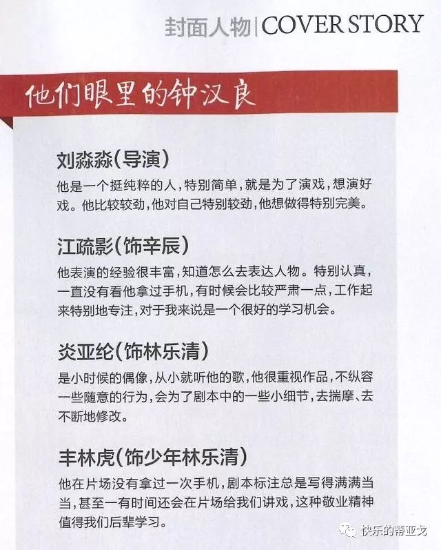 刘淼淼(导演)说,他(钟汉良)是一个挺纯粹的人,特别简单,就是为了演戏,想演好戏。他比较较劲,他对自己特别较劲,他想做得特别完美。