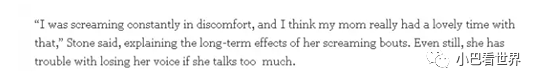 还是个小婴儿时,石头姐因为腹绞痛所以长时间哭喊,把嗓子哭哑了。即使到现在,如果用嗓过多,她就会短暂失声。
