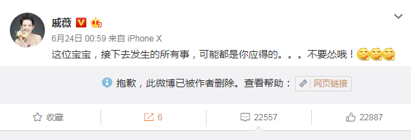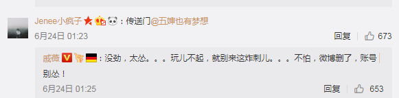 吓得黑粉连夜删了微博,戚薇还追着回应,“没劲、太怂,玩不起就别来这炸刺儿,不怕,微博删了账号别怂。”