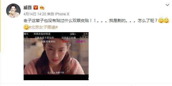 戚薇直接贴脸开大:“老子这辈子也没有贴过什么双眼皮贴,我是割的,怎么了呢”