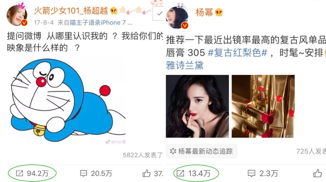 拥有过亿微博粉丝的杨幂,单条微博转发,仅是不到一千万粉丝的杨超越的七分之一。