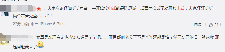 这段视频网友也有很多怀疑的地方:比如说,一开始接电话的似乎就是陈思诚,一段停顿之后换成了陌生人。