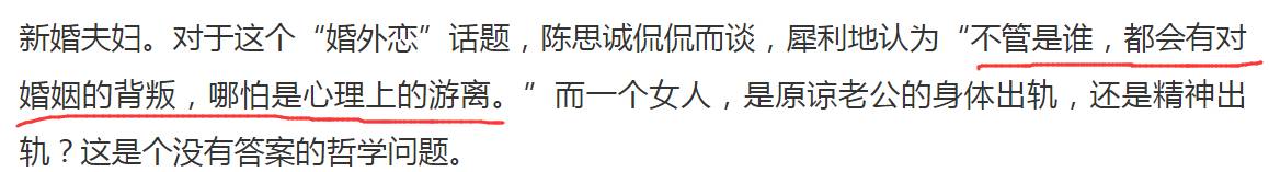 陈思诚在宣传《北京爱情故事》的时,谈到出轨一事时表示:不管是谁,都会有对婚姻的背叛,哪怕是心理上的游离。