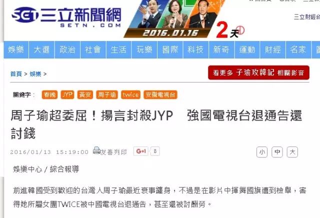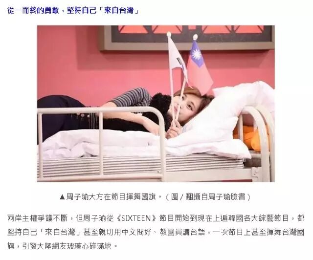 插播一句:事实上,周子瑜经纪jyp公司来后走得步步歪棋已说明其根本就是认识不到问题的关键或者就是抱着错误的看法不改正,jyp一步步把自己作死,还能允许这种公司来中国捞钱吗?此外,周子瑜的无知(或本性)被自然台独势力大做文章,问题就更加不一样了。比如深绿的“三立电视台”和“自由时报”、“苹果时报”等媒体,抓住周子瑜说自己“来自台湾”这句话,热捧周子瑜“为国争光”,“令强国人心碎”等等,言辞之间充满了对大陆和对“一个中国”底线的挑衅与嘲讽。(插播完毕)
